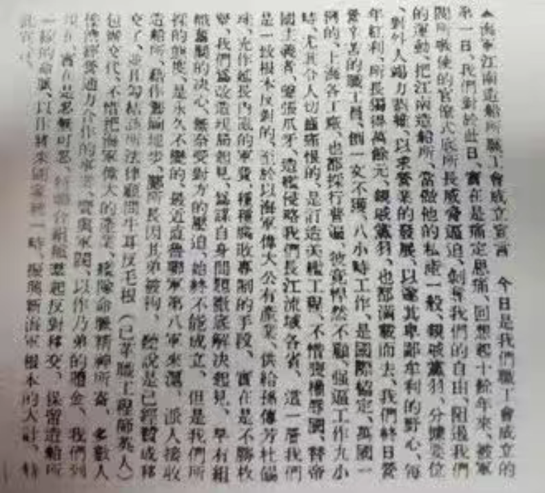 1927年3月21日,上海工人舉行第三次武裝起義,起義勝利后的第二天,在楊培生組織下,江南造船所職工會成立,并發(fā)布《職工會宣言》,揭露軍閥與官僚的反動面目,喚醒工人奮起斗爭。