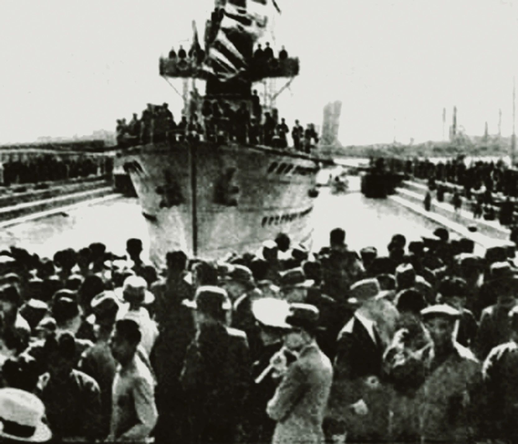 1928年8月16日午后,從上海老城廂西門通向江南造船的道路上,四處懸旗結彩。沿路張貼著“‘咸寧’下水是國民政府海軍的新建設”“鞏固海防、恢復海權”等標語。在江南造船廠區(qū)內臨江的一處船臺上,咸寧艦已經完工,靜靜地等待著下水的莊嚴一刻。這是江南造船為南京國民政府定制的第一艘軍艦。