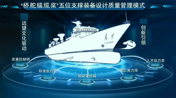 基于“全自主研發(fā)”和“巨系統(tǒng)抓總”的問(wèn)題導(dǎo)向,七〇八所“遠(yuǎn)望”研發(fā)創(chuàng)新團(tuán)隊(duì)凝聚智慧和力量,以創(chuàng)新為引領(lǐng)、以遠(yuǎn)望文化為驅(qū)動(dòng),提煉了“橋、舵、錨、纜、槳”五位支撐裝備設(shè)計(jì)質(zhì)量管理模式。各項(xiàng)核心管理要素相互作用、五位支撐裝備研發(fā)設(shè)計(jì)過(guò)程,構(gòu)建形成了一個(gè)良好向上、持續(xù)提升的團(tuán)隊(duì)質(zhì)量管理機(jī)制,為確保裝備研制質(zhì)量奠定了堅(jiān)實(shí)基礎(chǔ)。“橋”是“艦橋”的簡(jiǎn)稱(chēng),是艦船駕駛控制、觀察及決策的主要設(shè)施,其作用如同質(zhì)量控制。“舵”是控制艦船航行方向的主要設(shè)備,其作用如同規(guī)范指引。“錨”作為艦船停泊和定位的主要設(shè)備,其作用如同試驗(yàn)驗(yàn)證。“纜”作為艦船靠幫連接的主要設(shè)備,其作用如同接口管理。“槳”是提供艦船航行動(dòng)力的主要設(shè)備,其作用如同人才保障。